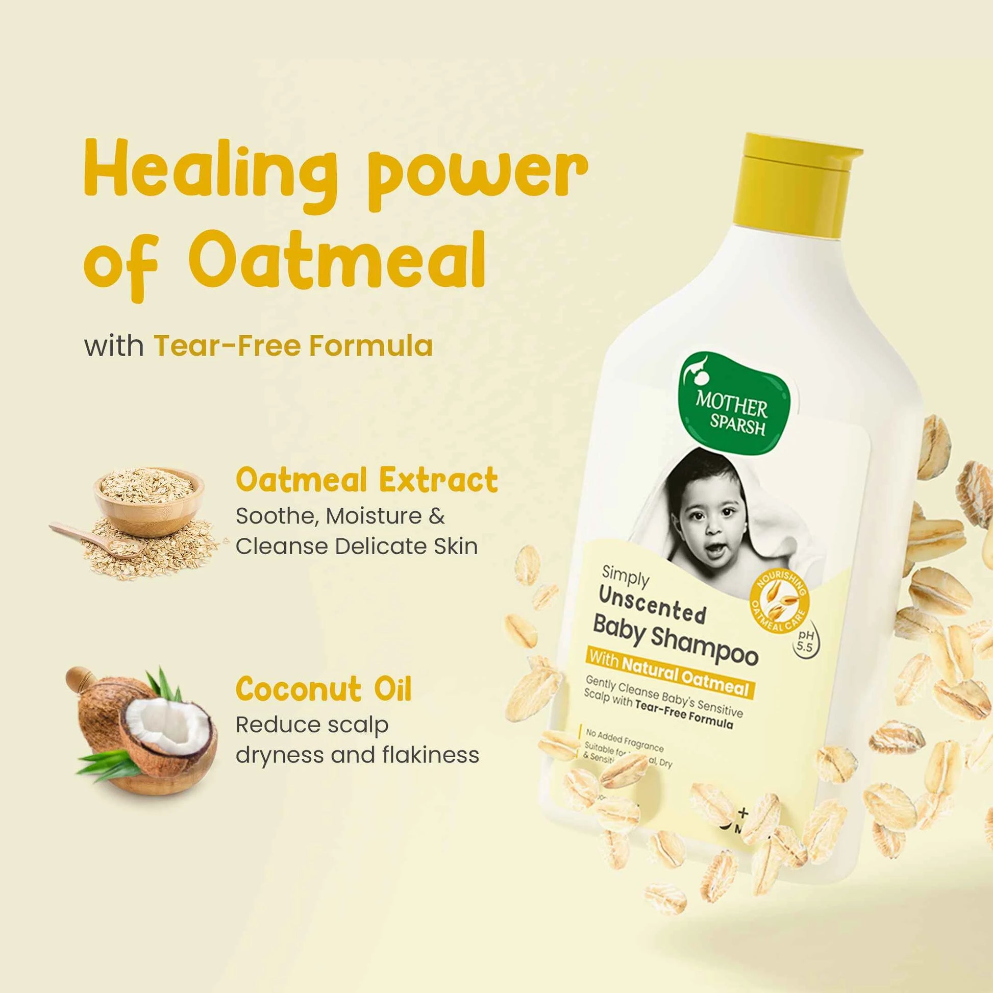 Meet Mother Sparsh Simply Unscented Baby Shampoo, made with Natural Oatmeal to care for baby’s developing hair & Scalp from Day 1. Its formula is balanced to a pH of 5.5 to protect your baby from 3 Signs Of Discomfort: Dryness, Itching, & Flaking of the delicate scalp & hair shaft. It is suitable for Normal, Dry & Sensitive skin! What makes it the best fragrance-free shampoo for babies? The soothing properties of natural oats help alleviate dryness, and irritation while gently cleansing Baby’s sensitive scalp with a Tear-Free Formula. Plus the soft lather of a balanced pH leaves your little one’s scalp & hair shaft clean gently!